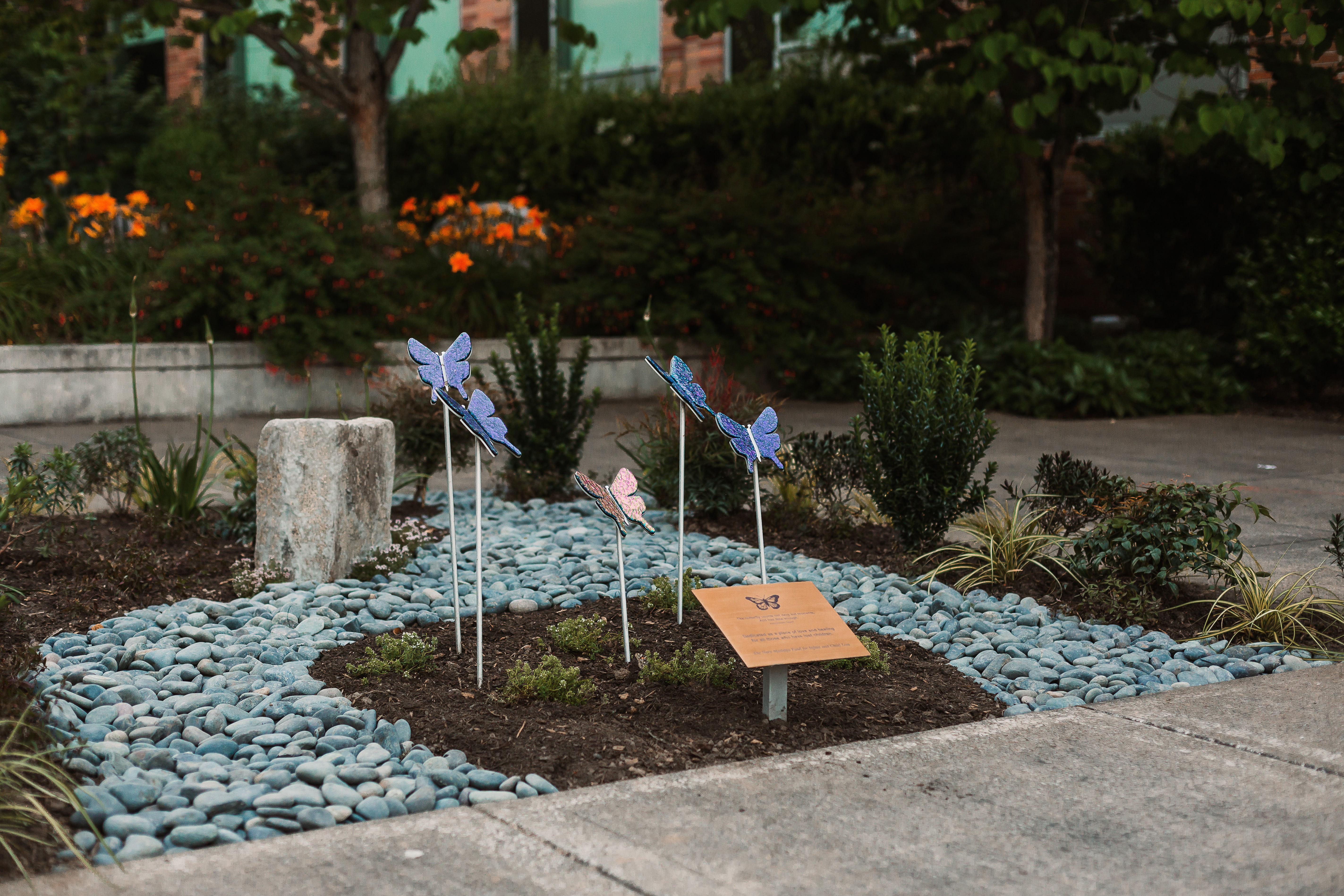 - Our third goal was to create a place of reflection in the hospital space. Supporters, including the late Rev. Gregg Selander, advocated for a space in the new facility’s Healing Garden, and, in 2006, the glass butterfly memorial was installed with a plaque reading “Dedicated as a place of love and healing for all those who have lost children.” Today the memorial is the gathering place for our events.